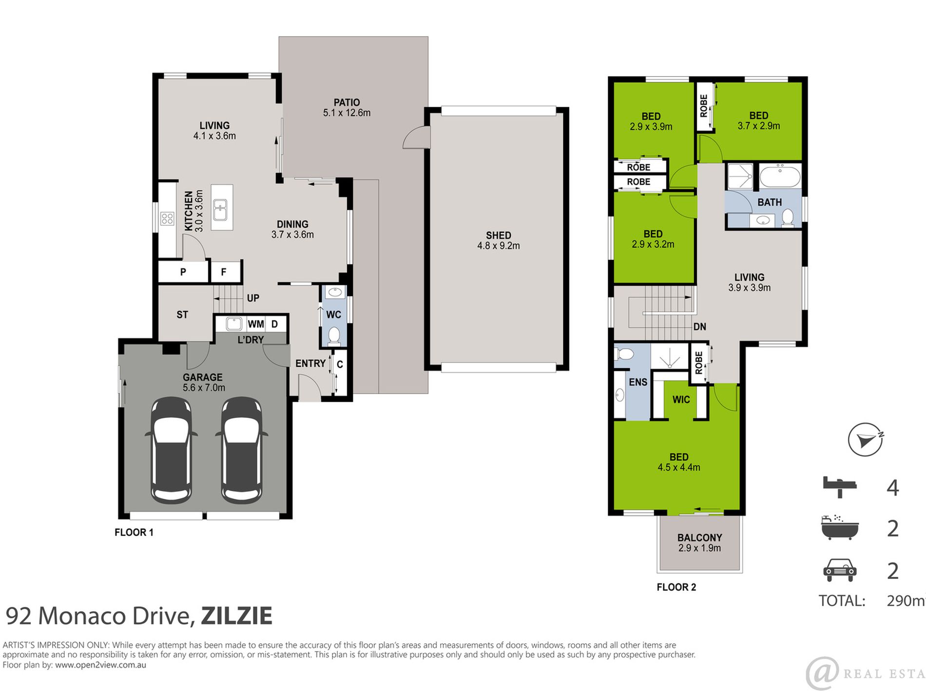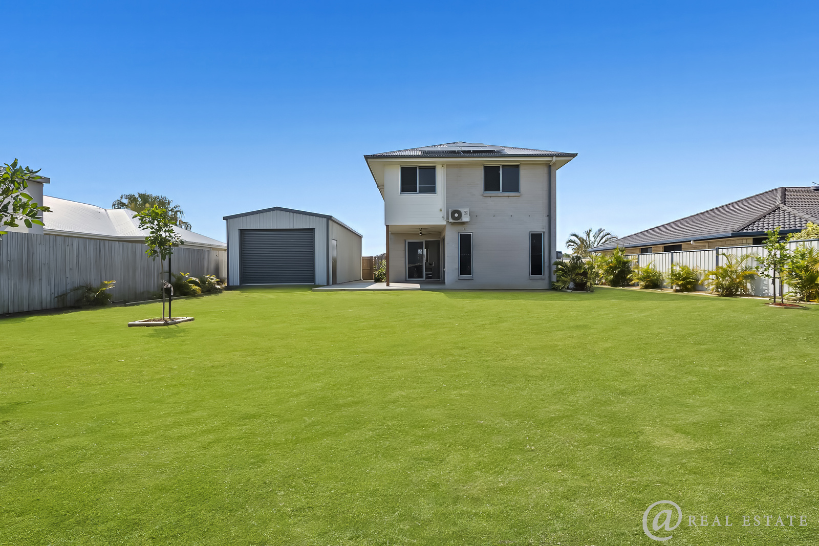 A 9.5 m × 4.5 m shed with 3 m high clearance (front and rear roller doors) easily accommodates a boat, caravan, and workshop.