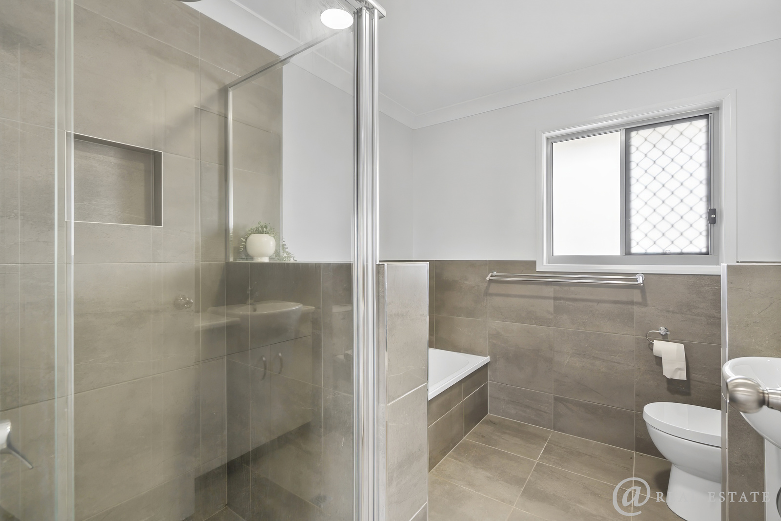 The main bathroom offers a separate bath and shower with contemporary style.