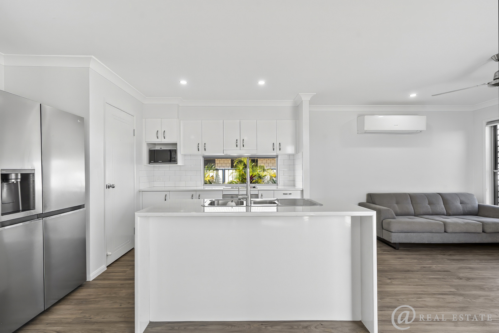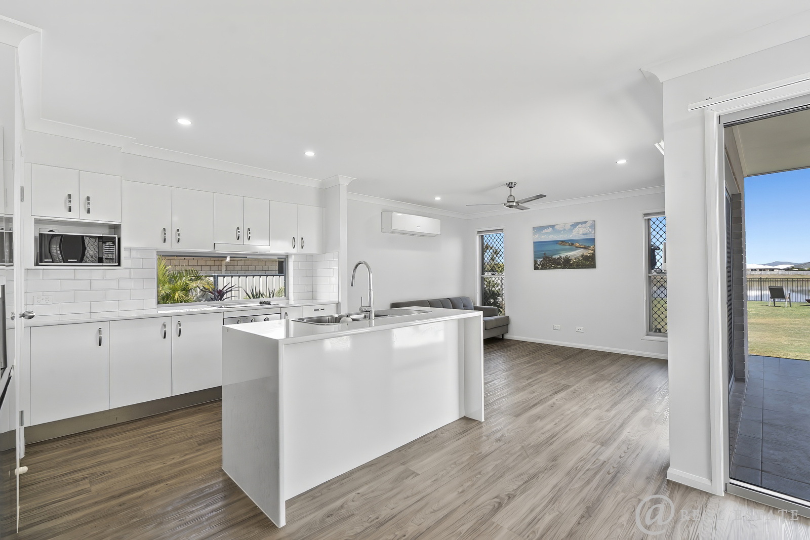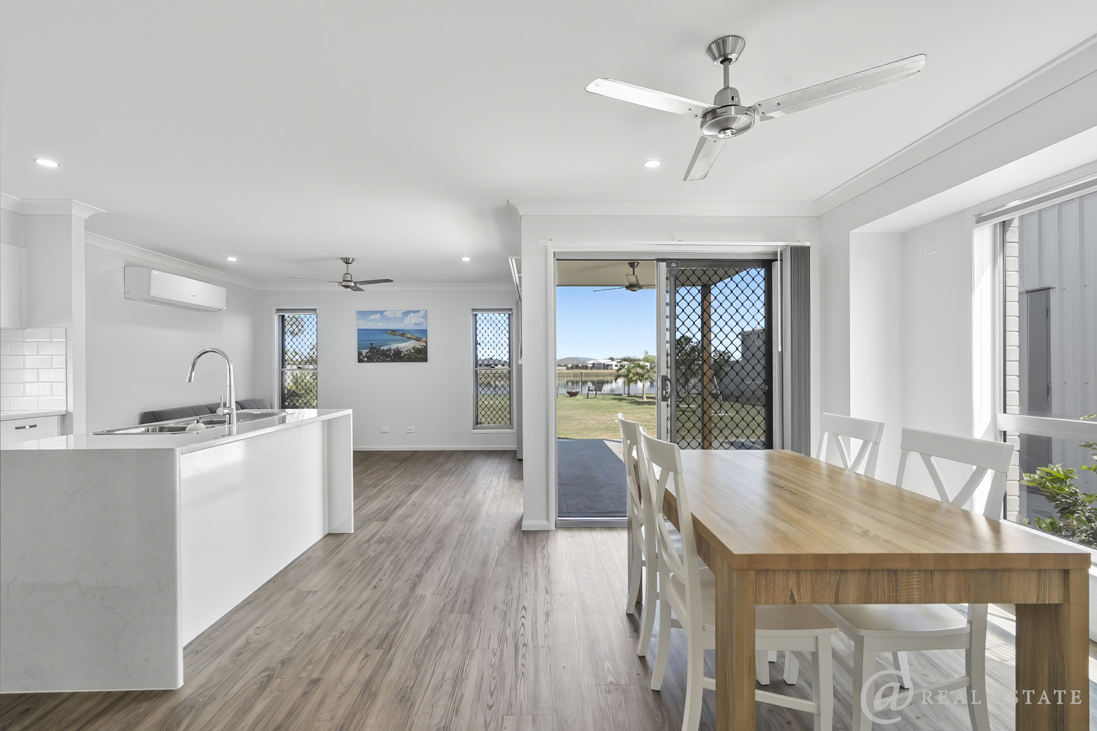 Practical, open-plan living, dining, and kitchen area with air conditioning that flows seamlessly to the outdoor entertaining space — the perfect spot for sunset drinks or morning coffee by the lake.