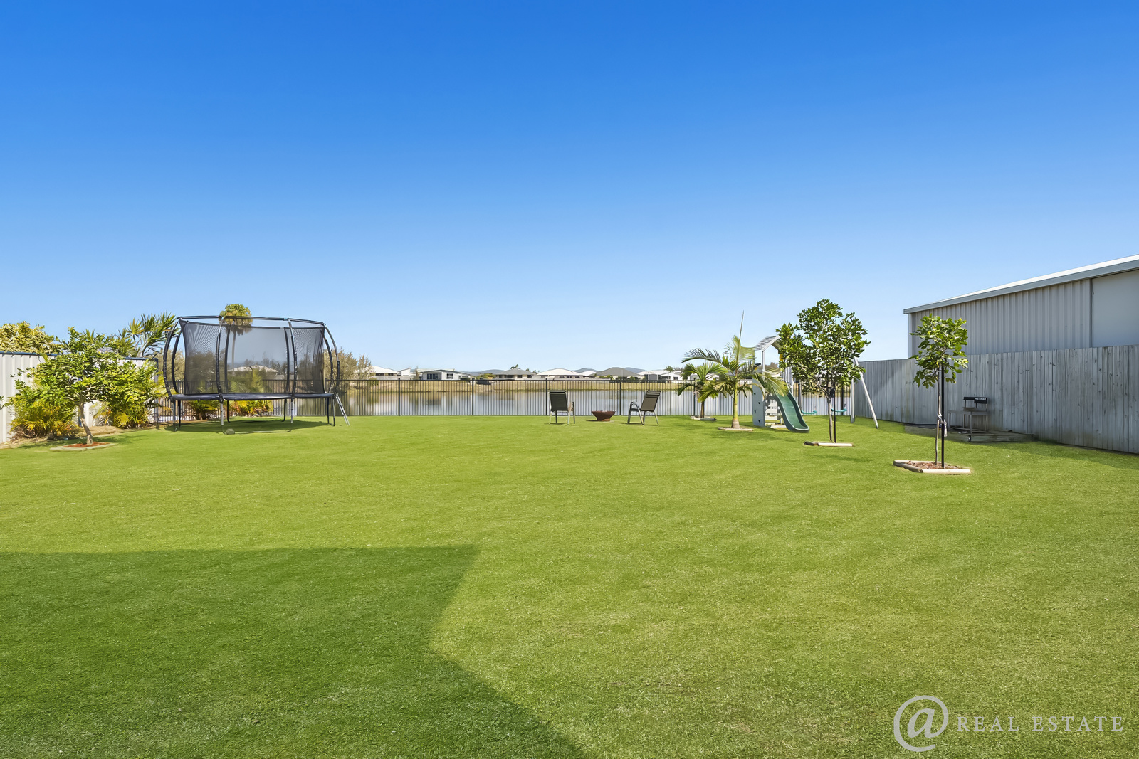 Fully fenced yard with side access and a gate leading straight to the lake.
