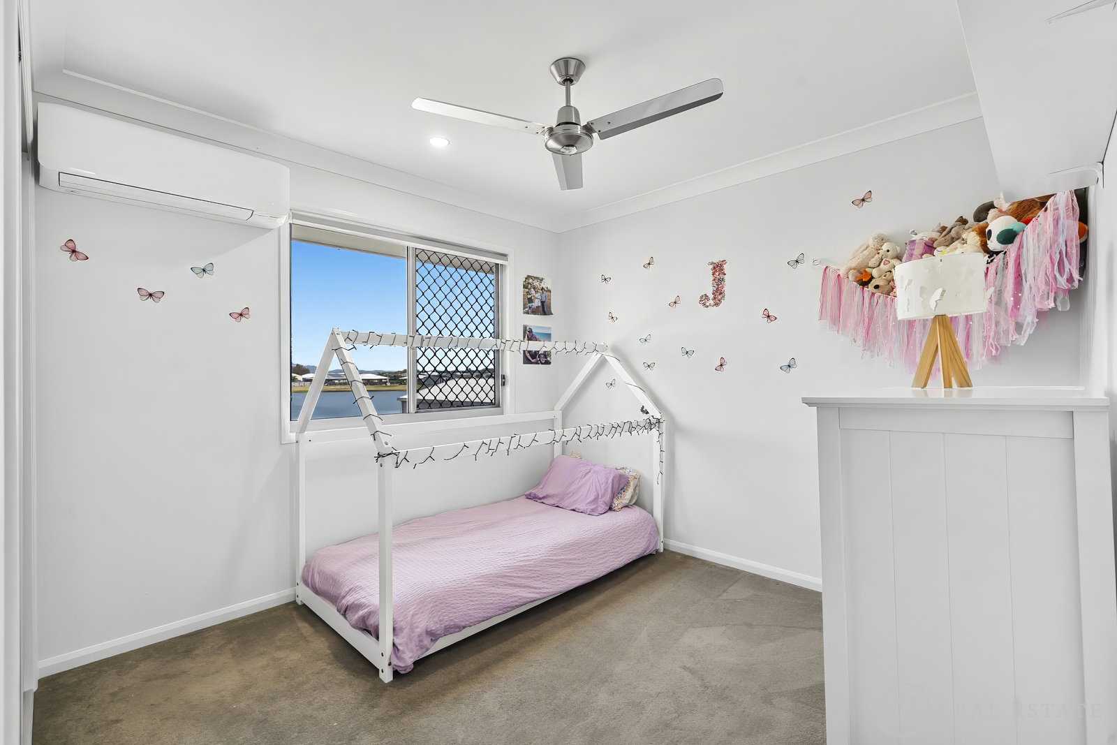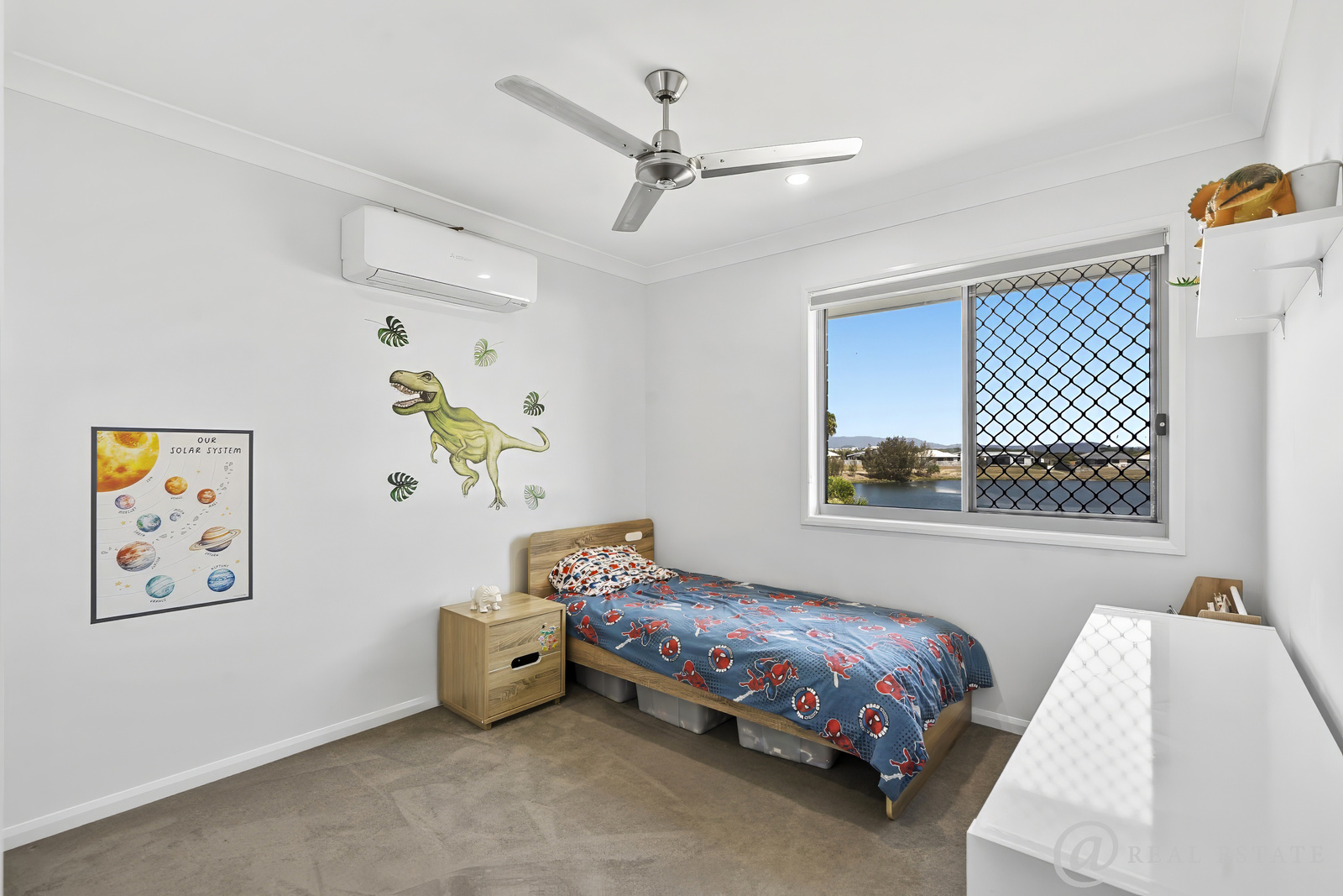 Bedrooms 2 and 3 overlook the lake and include built-in robes, ceiling fans, and air conditioning.