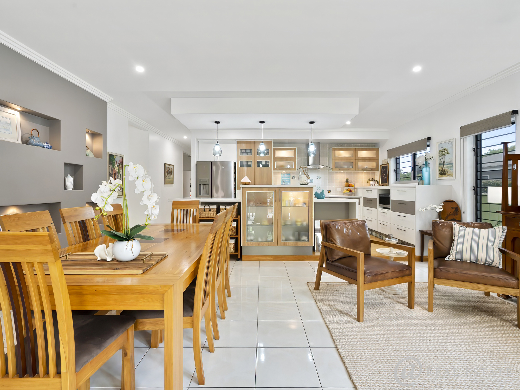- The heart of the home is the expansive open-plan living area, where feature raised timber-look floors and abundant natural light create warmth and elegance.