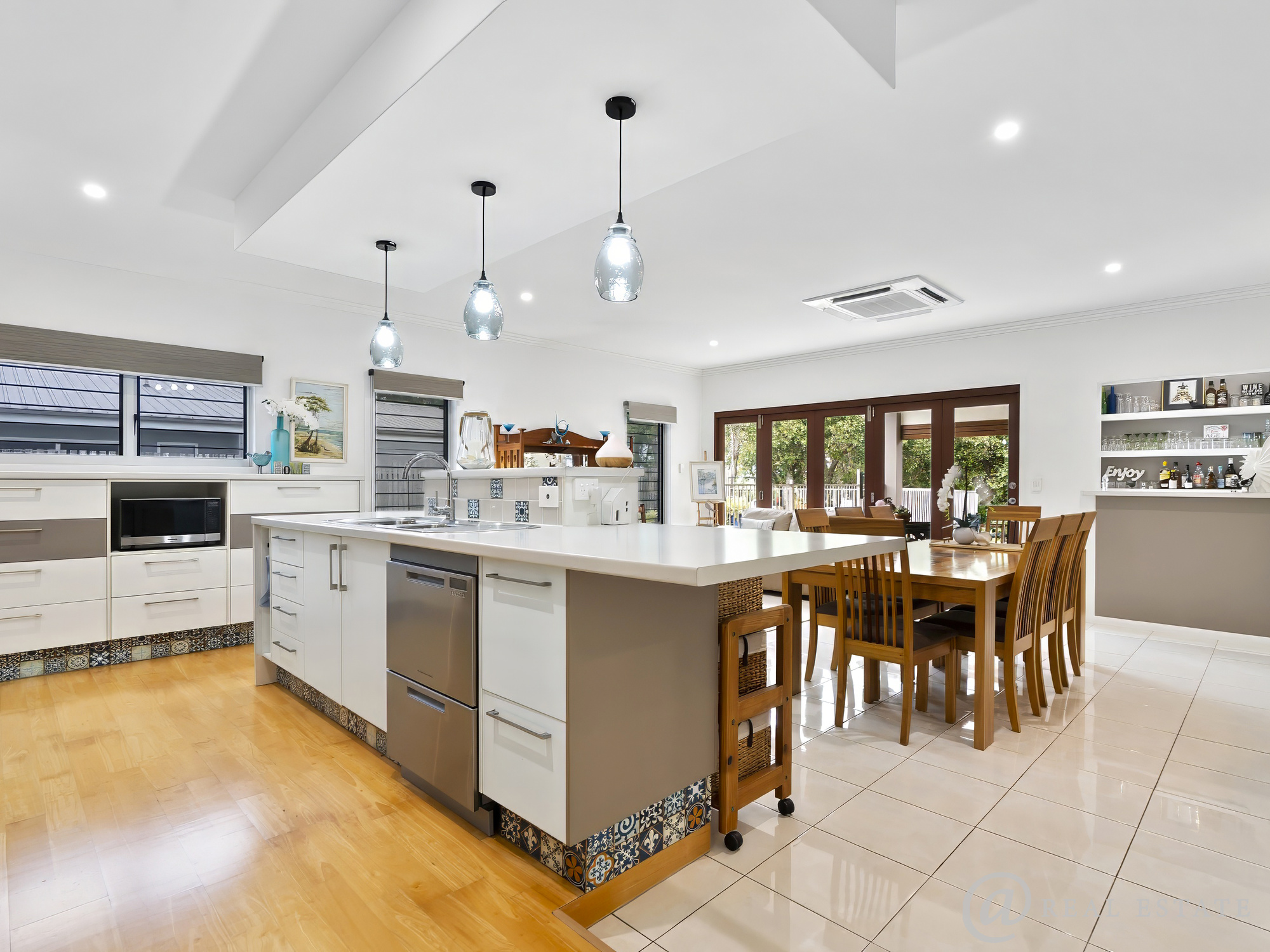 - A Kitchen that inspires is as functional as it is beautiful, this kitchen truly delivers. Showcasing stylish feature cabinetry, Island bench with breakfast bar, Exceptional bench and storage capacity, Induction cooktop, Two-drawer dishwasher, Pendant lighting, Double-plumbed fridge space and Louvre windows for airflow