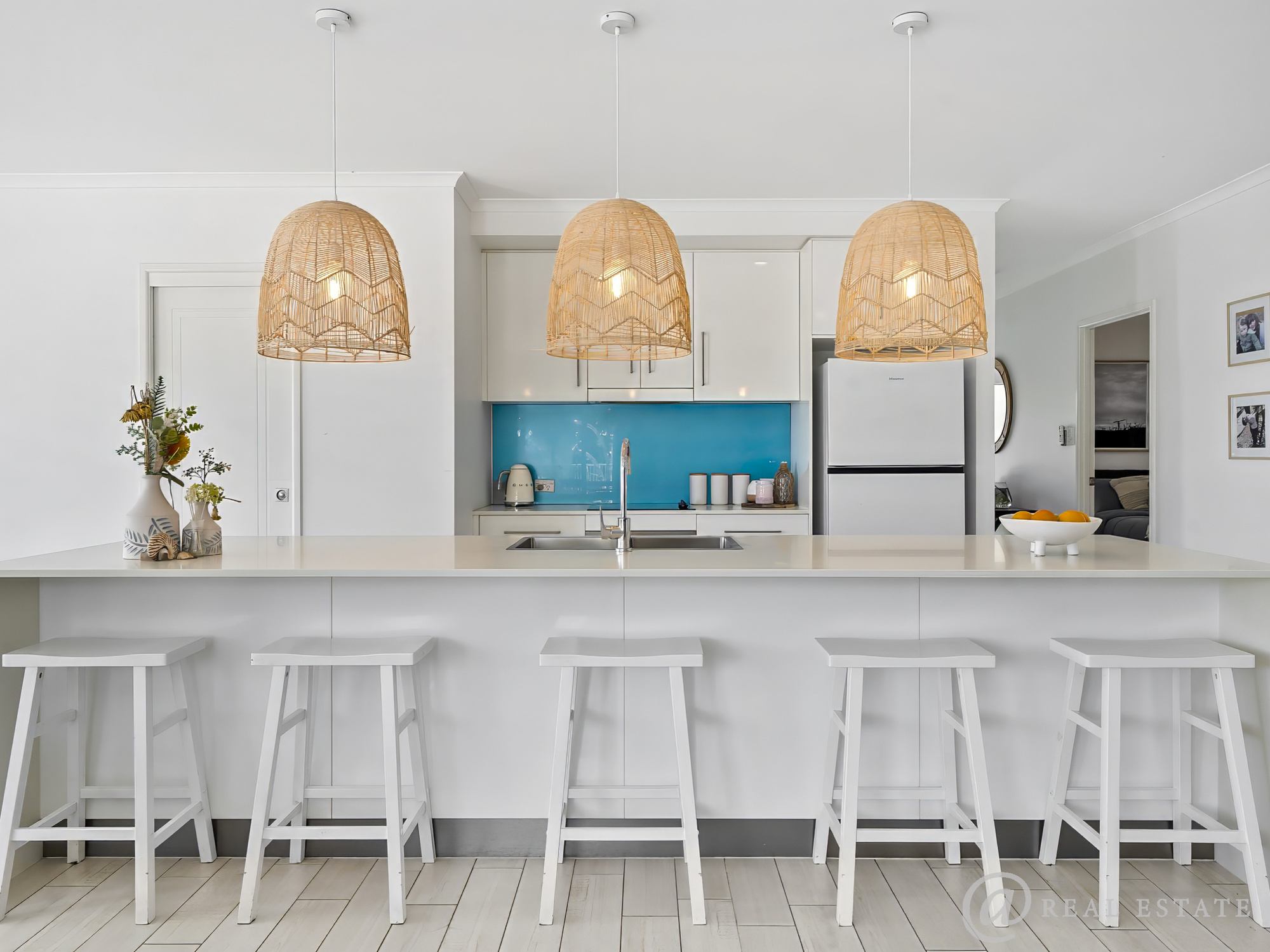 - A Kitchen That Inspires: Elegant pendant lighting, stone bench tops, a large island bench with breakfast bar, soft-close drawers, walk-in pantry, gooseneck tap, deep double sinks and a striking blue glass splash-back. Whether it’s weeknight dinners or weekend gatherings, this space makes every meal a moment to enjoy.