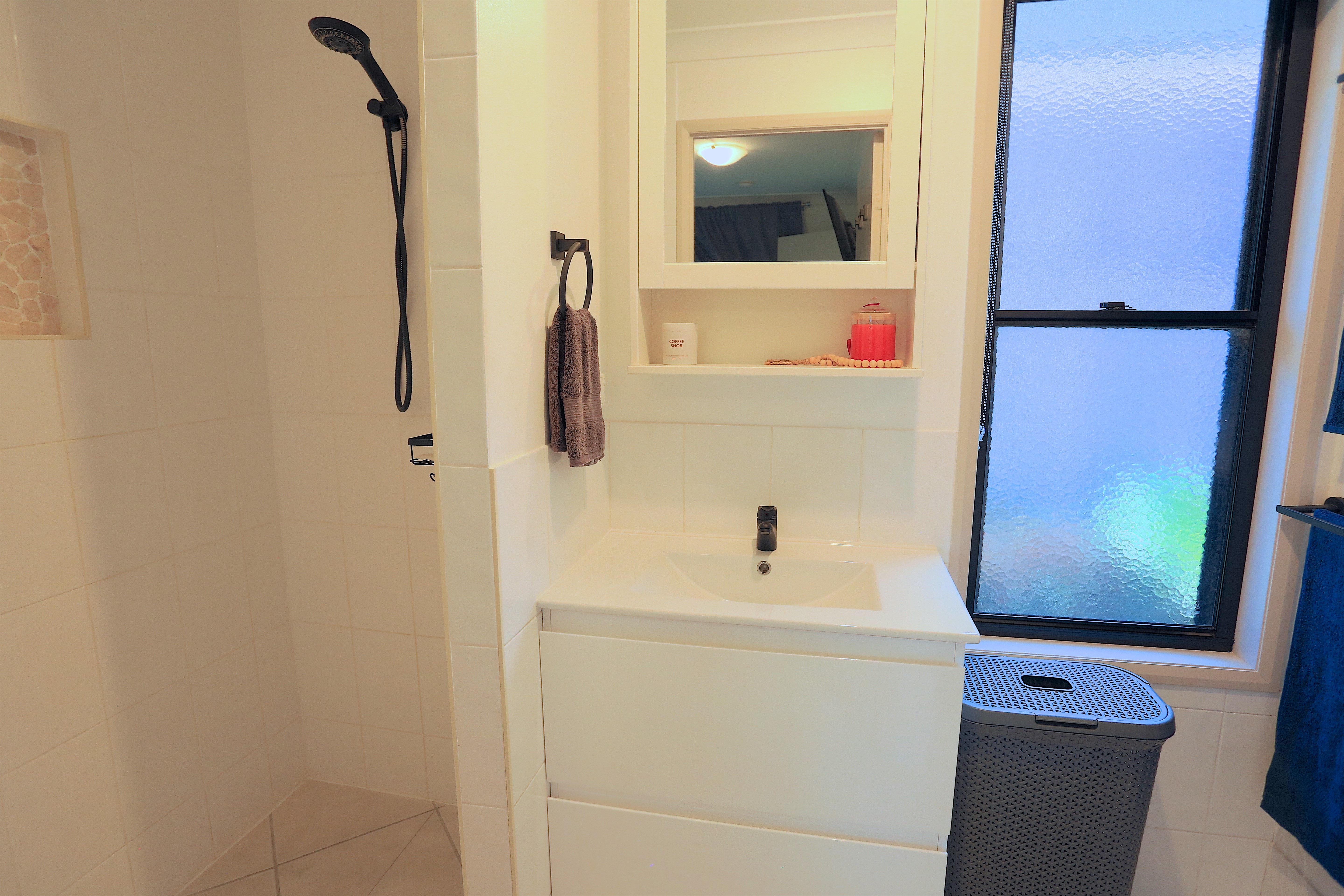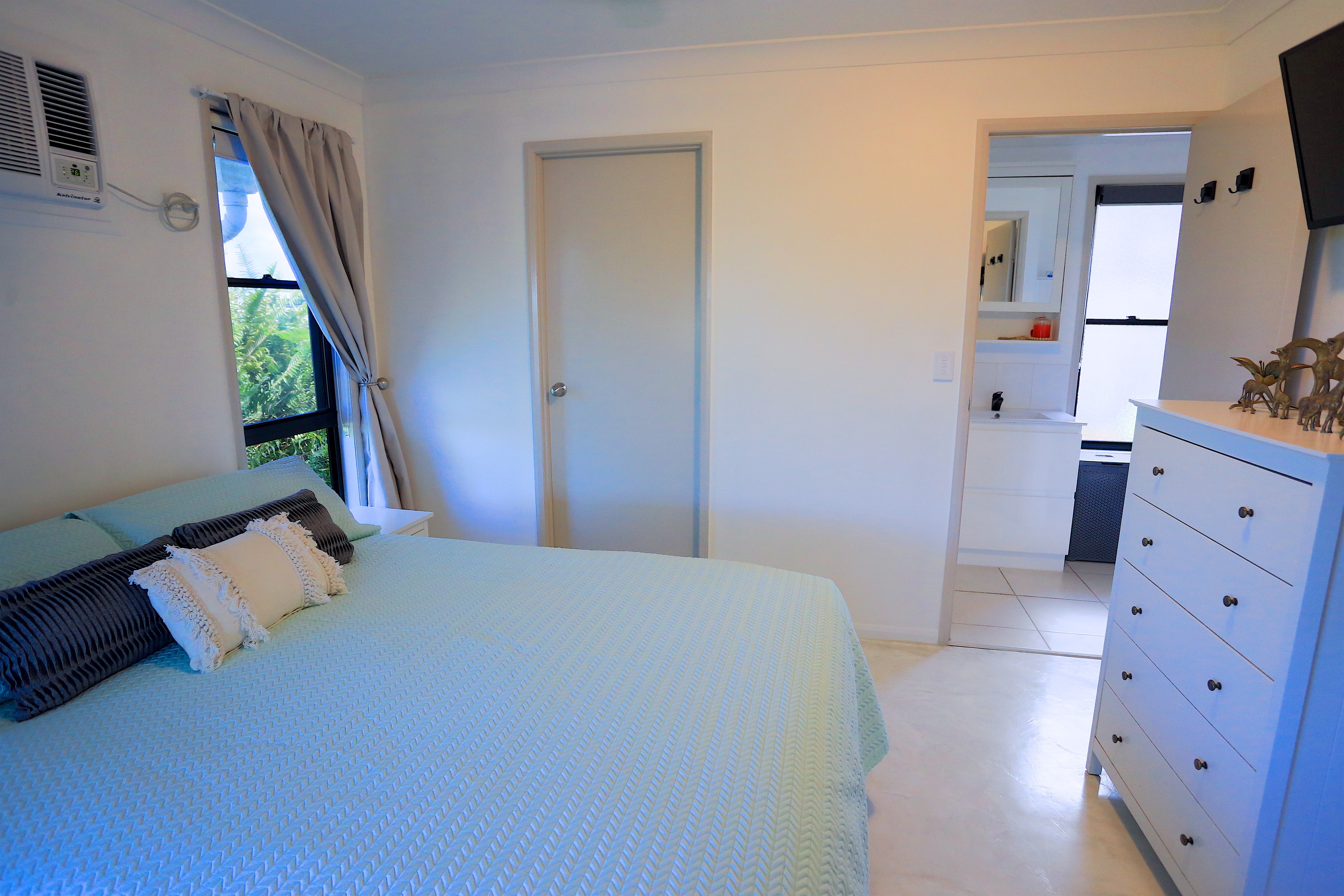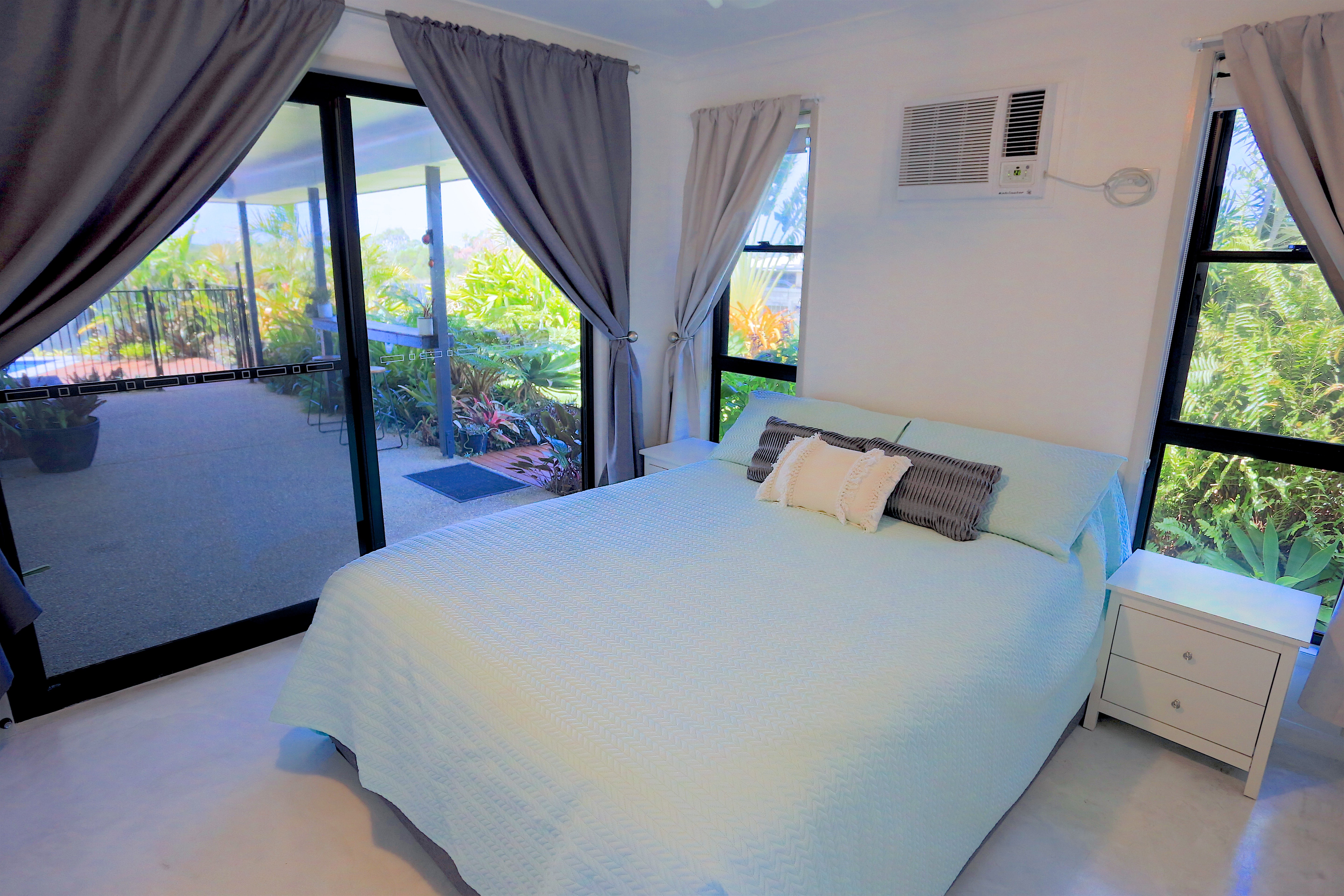 - The master suite is a true retreat featuring air conditioning, a walk-in robe with built-in shelving, ensuite with walk-in shower, and sliding doors that open directly to the outdoor area overlooking lush greenery.