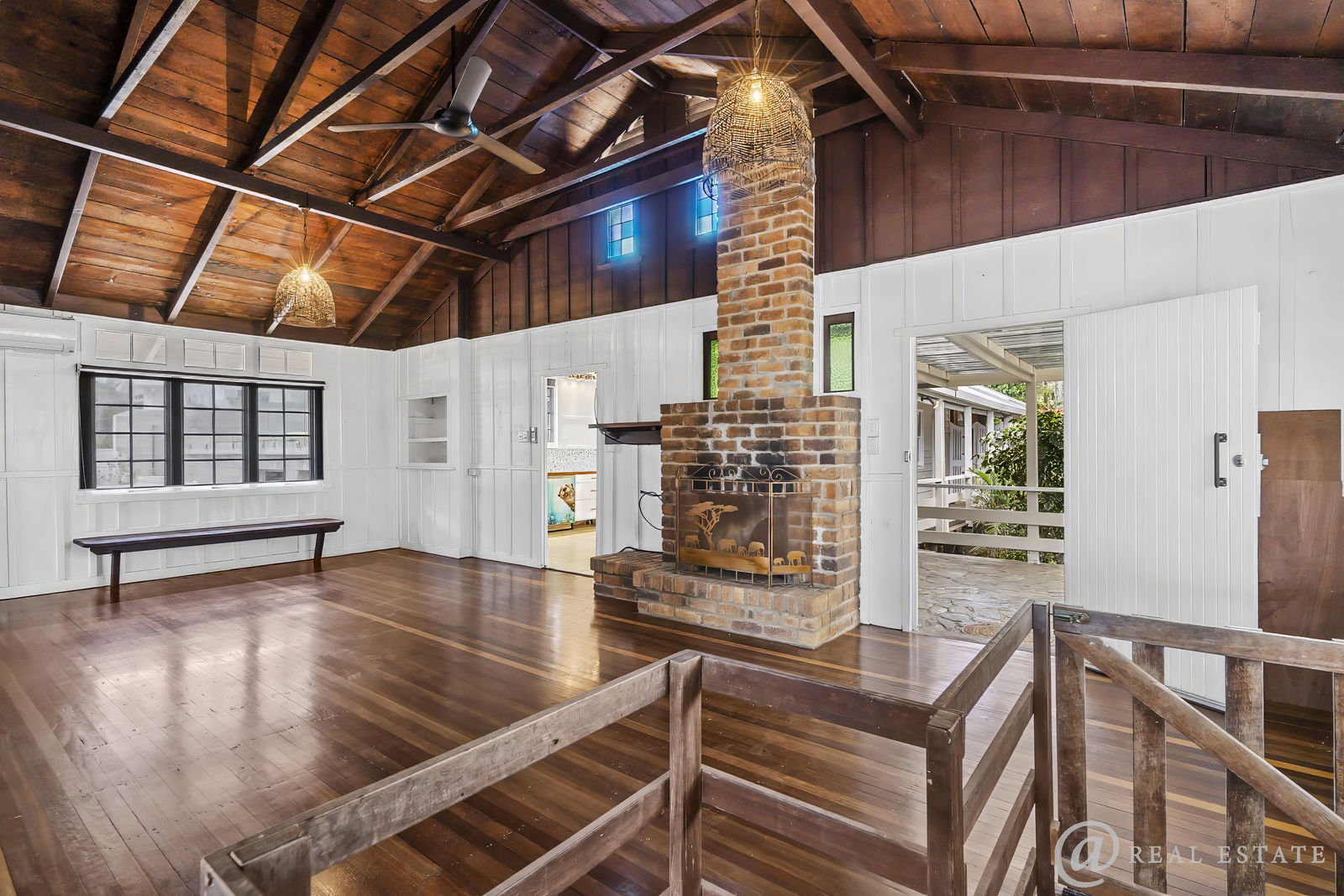 - Large lounge with striking brick fireplace and soaring timber ceilings