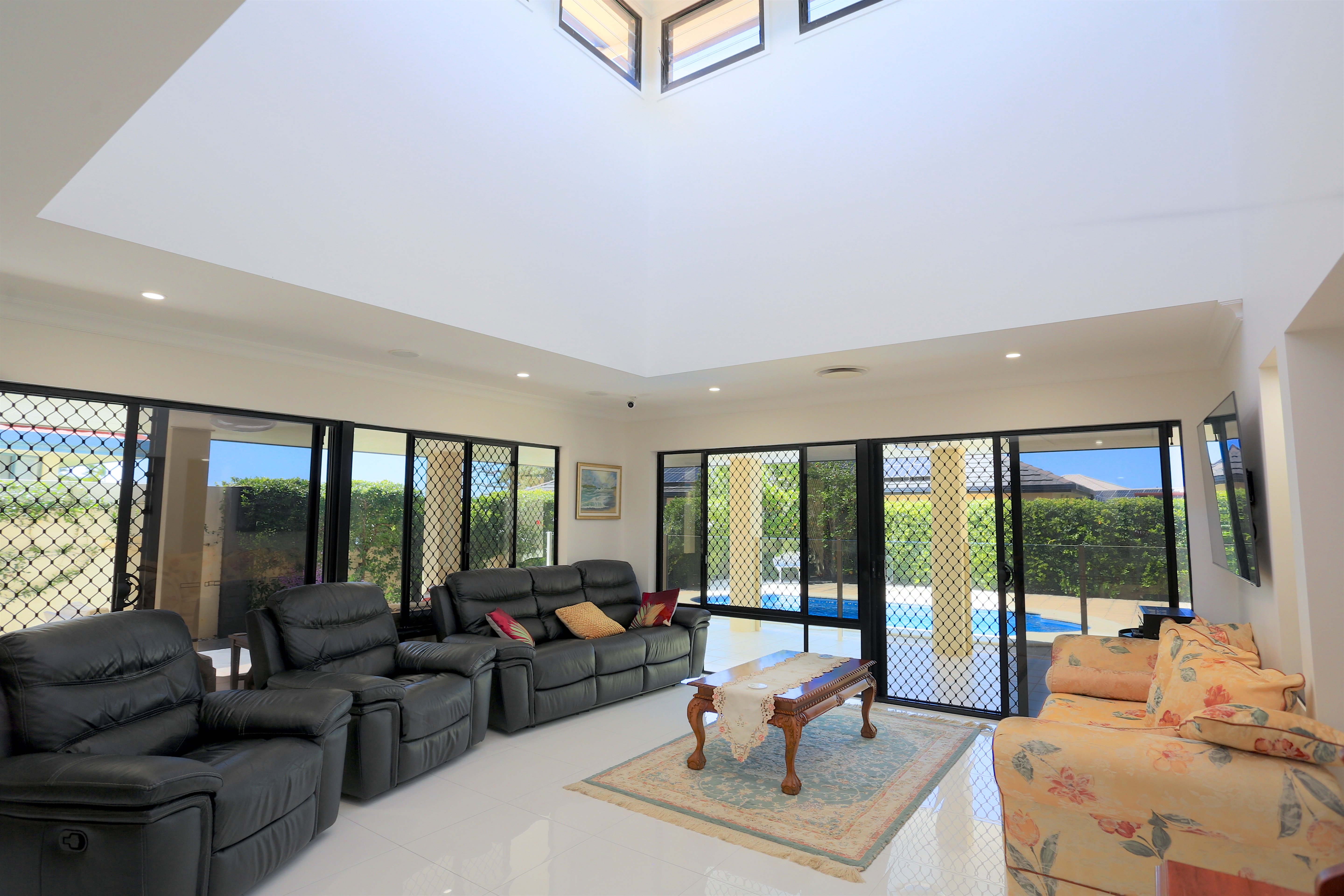 Accommodation is generous. Four large bedrooms with lush carpets, built-in robes and security screening provide comfort and privacy for family or guests. The master suite is truly oversized, featuring its own air-conditioning zone, a large walk-in robe, fan, direct access to the pool patio and a quality ensuite with rain shower, heated lights and corner spa bath.