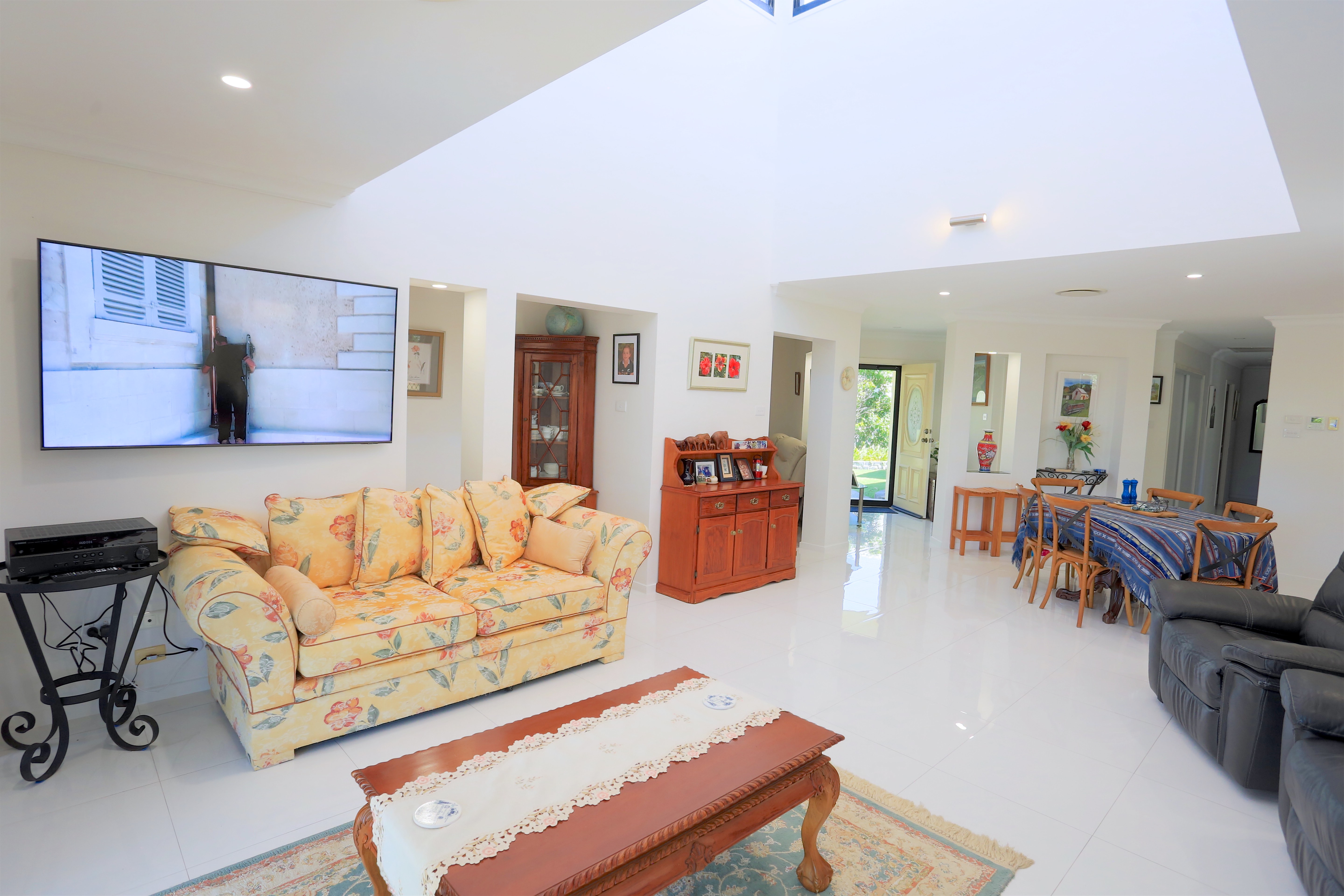 Multiple living zones offer flexibility—an open-plan tiled living/dining area for entertaining, plus a carpeted second lounge for movie nights or quiet retreats. Built-in speakers, Yamaha amplifier and 65” QLED TV (included).