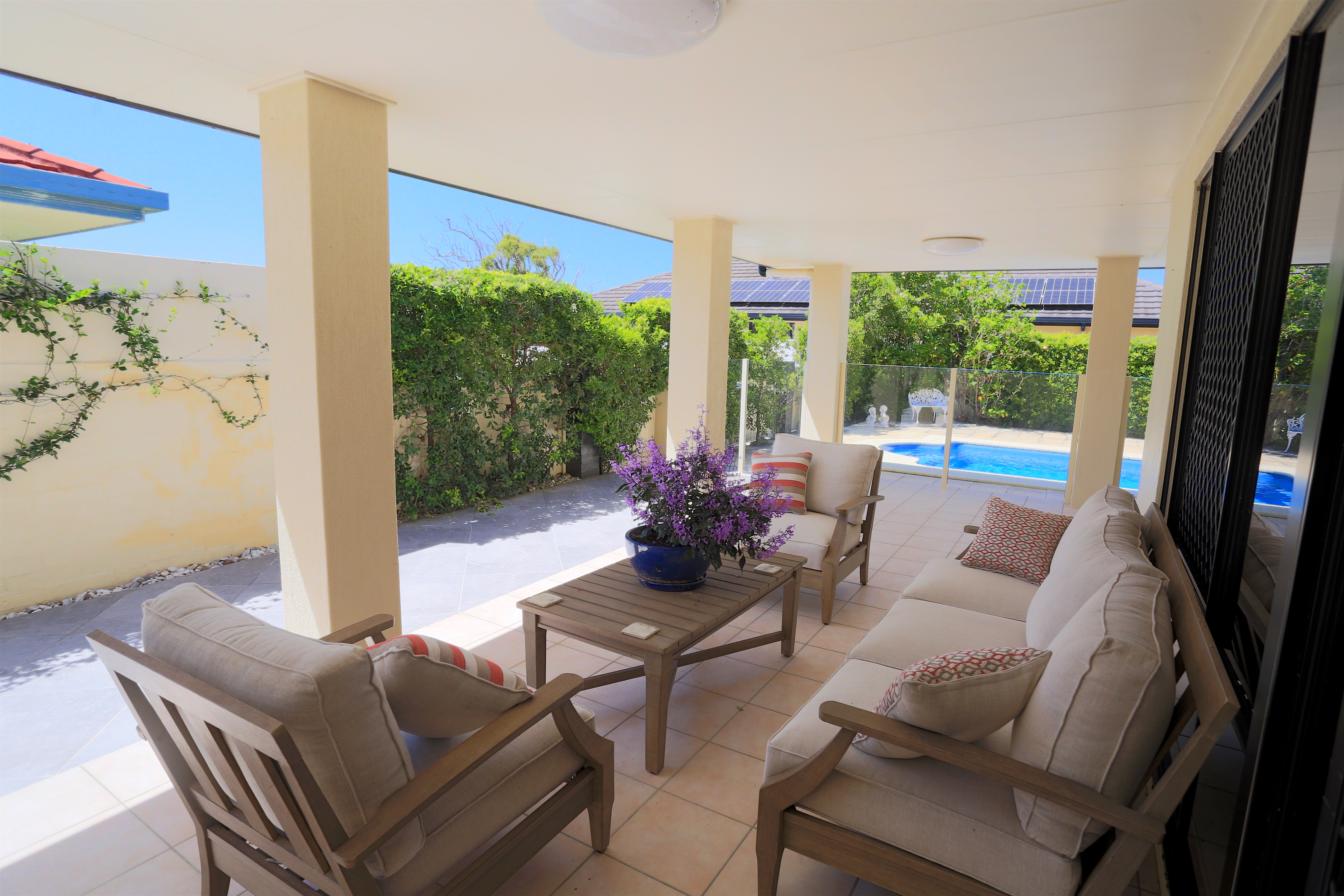 Outdoors, life gets even better. A beautiful saltwater pool with seating ledges is framed by tropical gardens, paved relaxation zones and glass fencing. The lush lawns are maintained via an Orbit underground irrigation system, and the alfresco spaces make hosting effortless all year round.