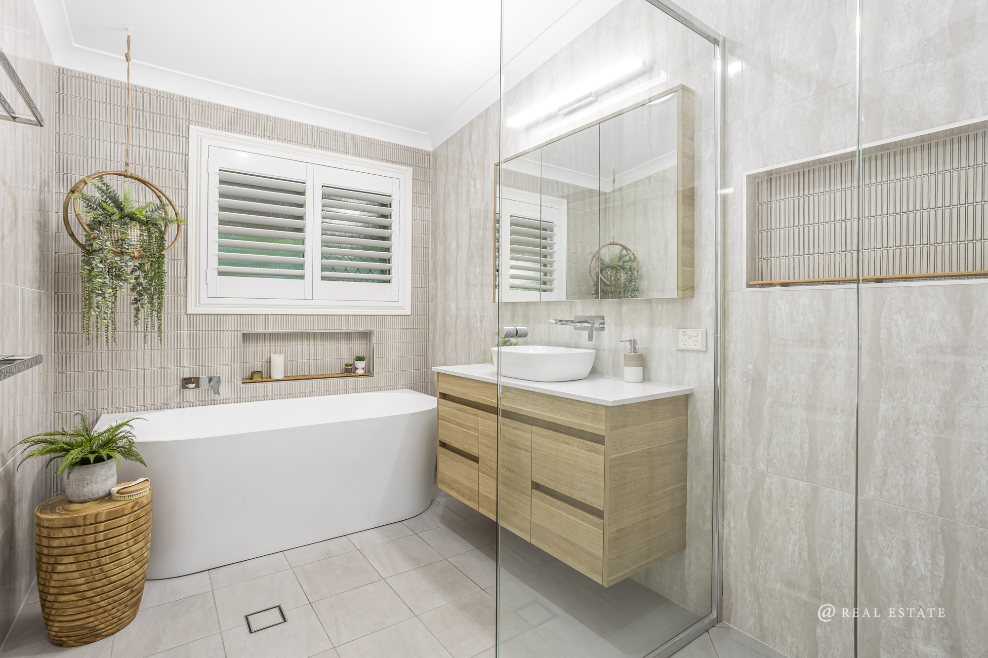 Inside the home features four spacious bedrooms, two newly renovated bathrooms (including a stunning main bathroom with large freestanding bath) and two separate living areas enhanced by high raked ceilings that create a wonderful sense of space and light. Plantation shutters throughout and air-conditioned living zones ensure year-round comfort and style.