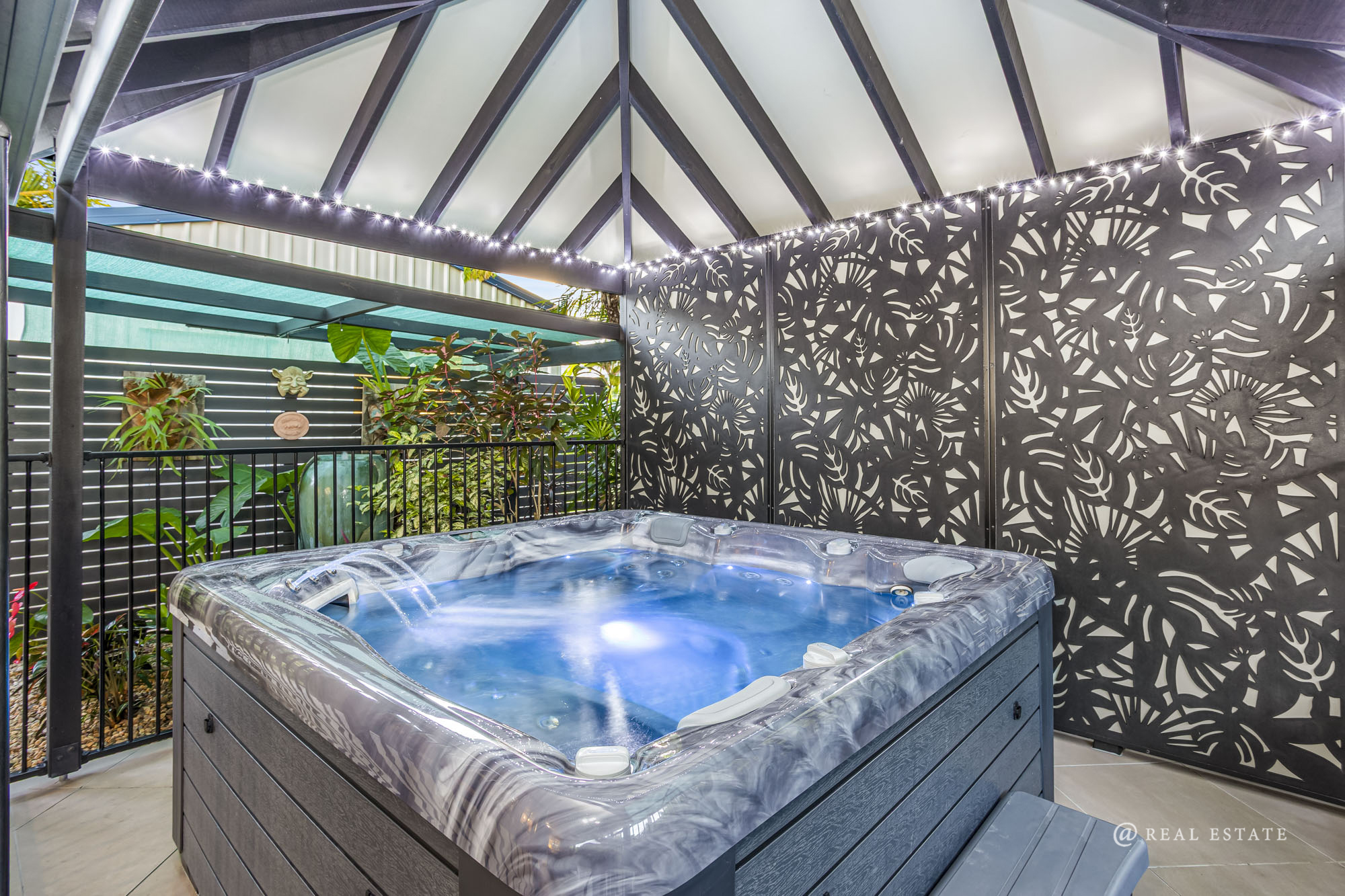 The heart of the home flows seamlessly to an expansive, very private outdoor entertaining area — perfect for hosting family and friends — complete with a five-person spa and surrounded by immaculately landscaped gardens.