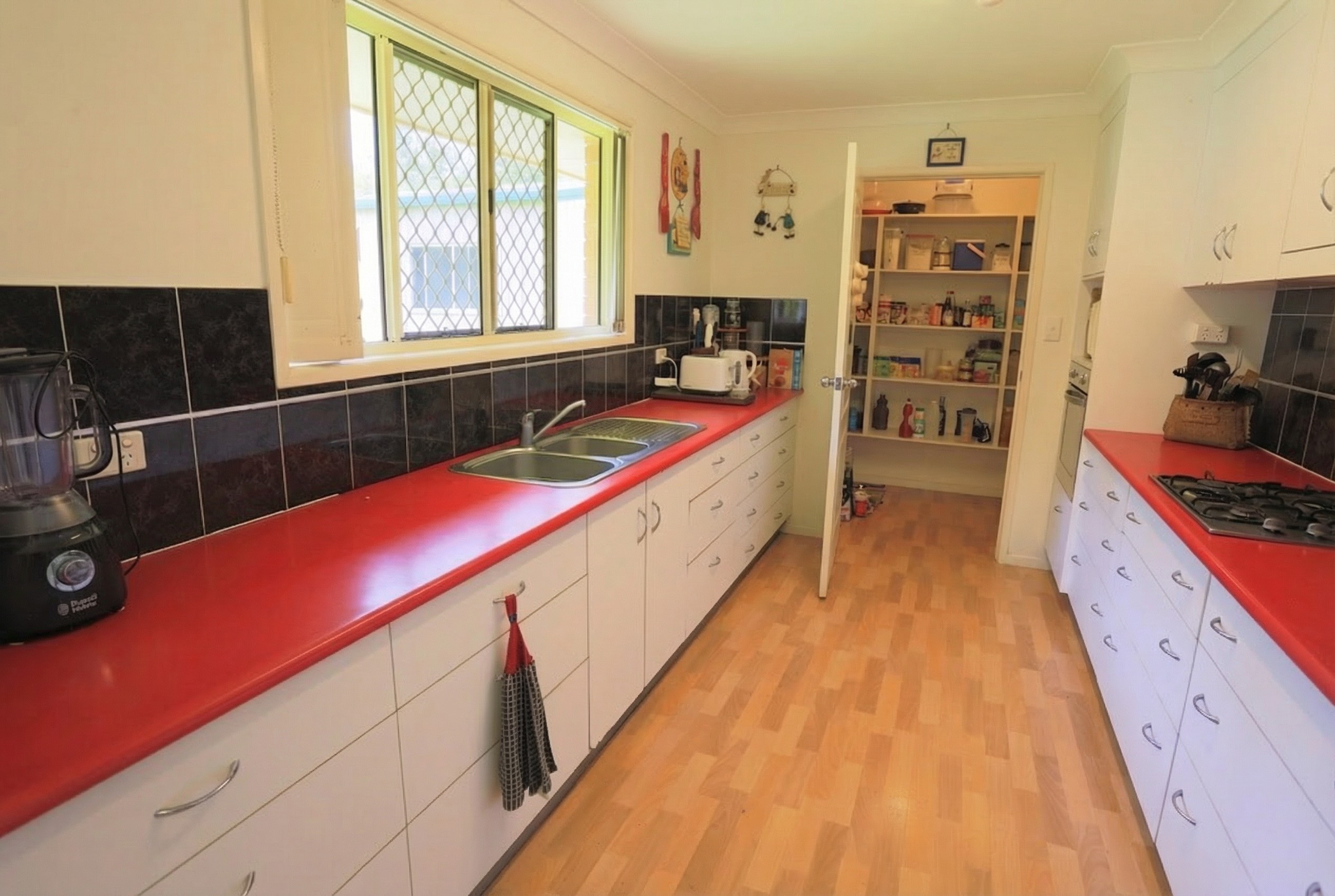 The spacious kitchen, featuring generous bench space, ample storage drawers, gas cooking, and a large walk-in pantry, and overlooking the backyard and surrounding acreage.