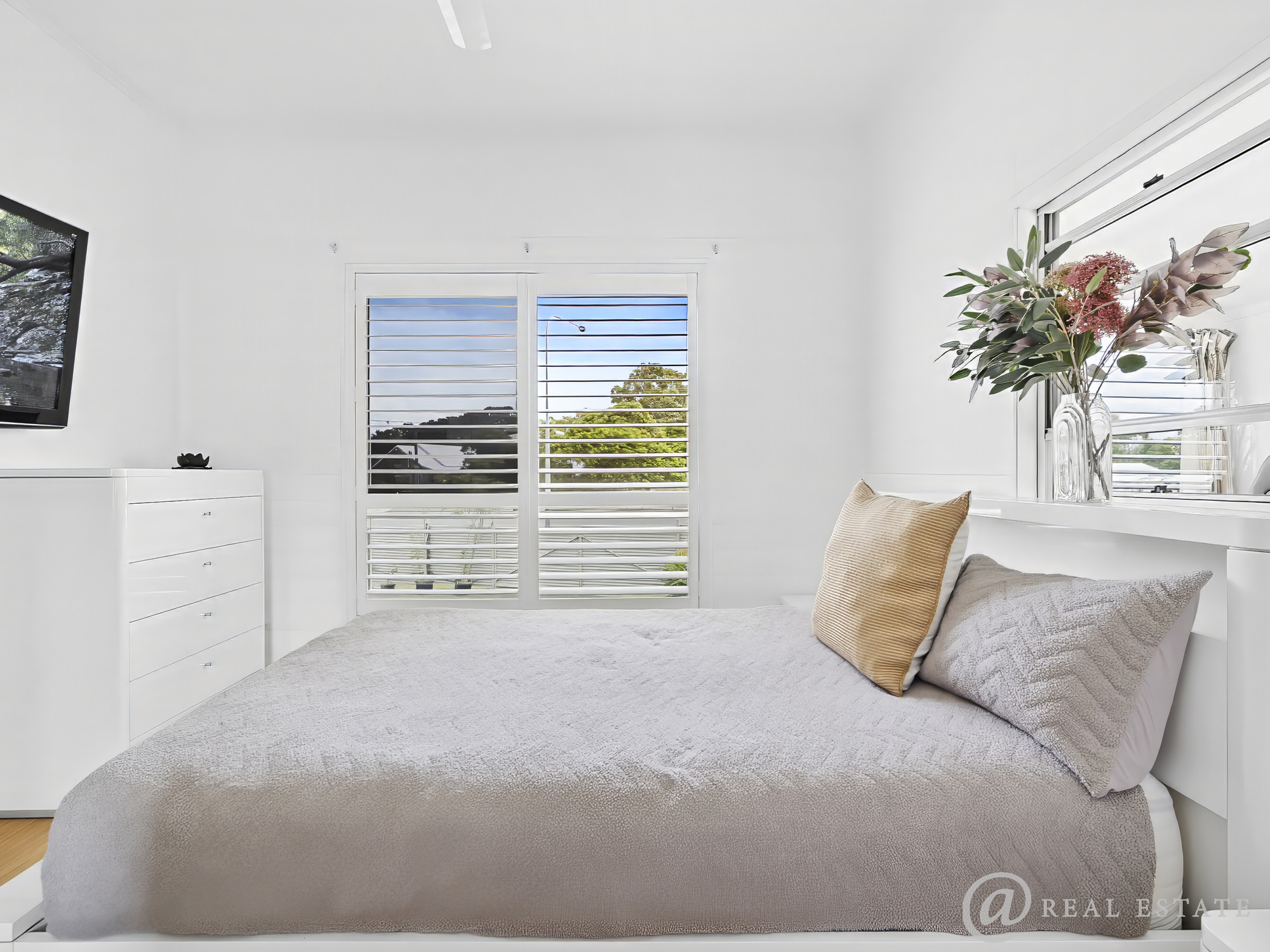 - Master bedroom with mirrored built-in robe, plantation shutters, air conditioning & refreshing garden outlook