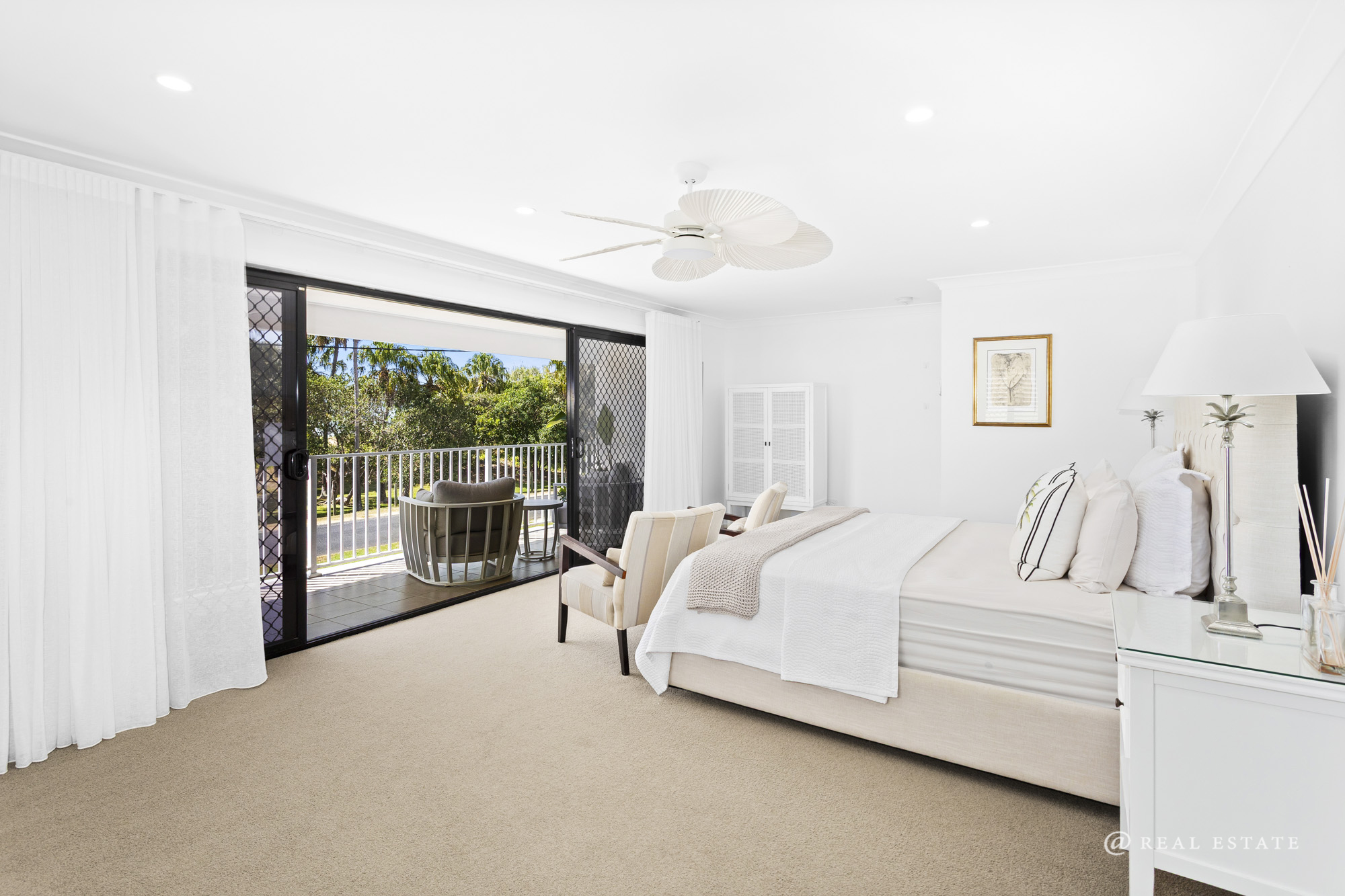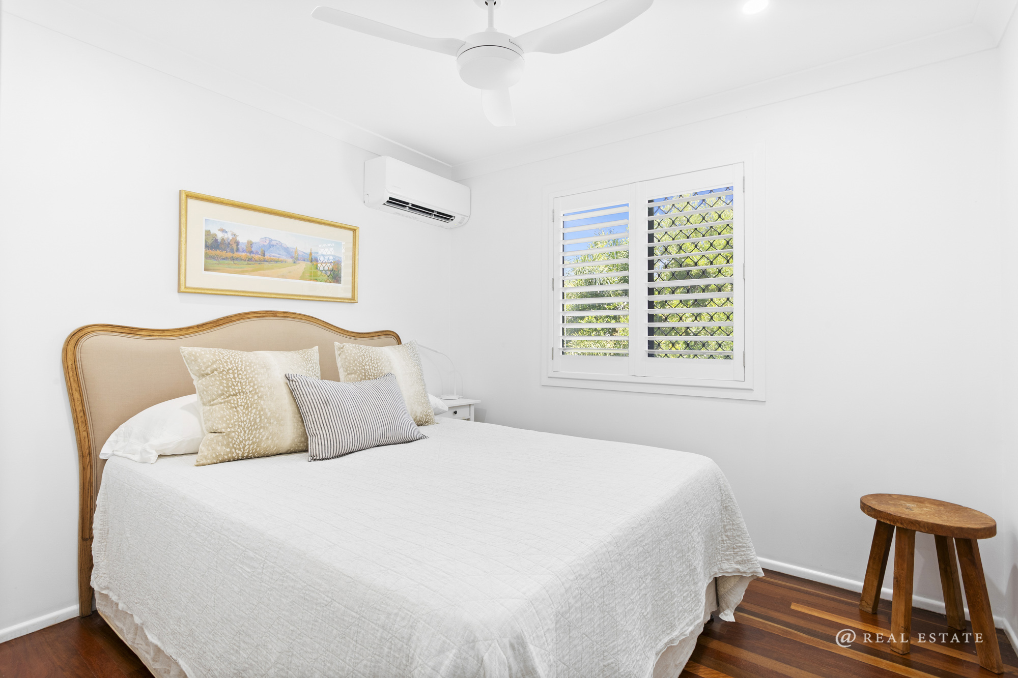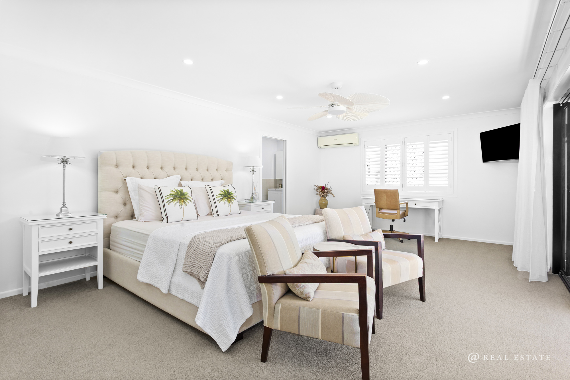 The home comprises five bedrooms, each with air conditioning and ceiling fans. The master suite is a true retreat—expansive in scale and privately positioned, complete with a large walk-in robe and a well-appointed ensuite featuring dual shower and new vanity. Double glass doors open to a private patio, softened by stunning linen sheers.