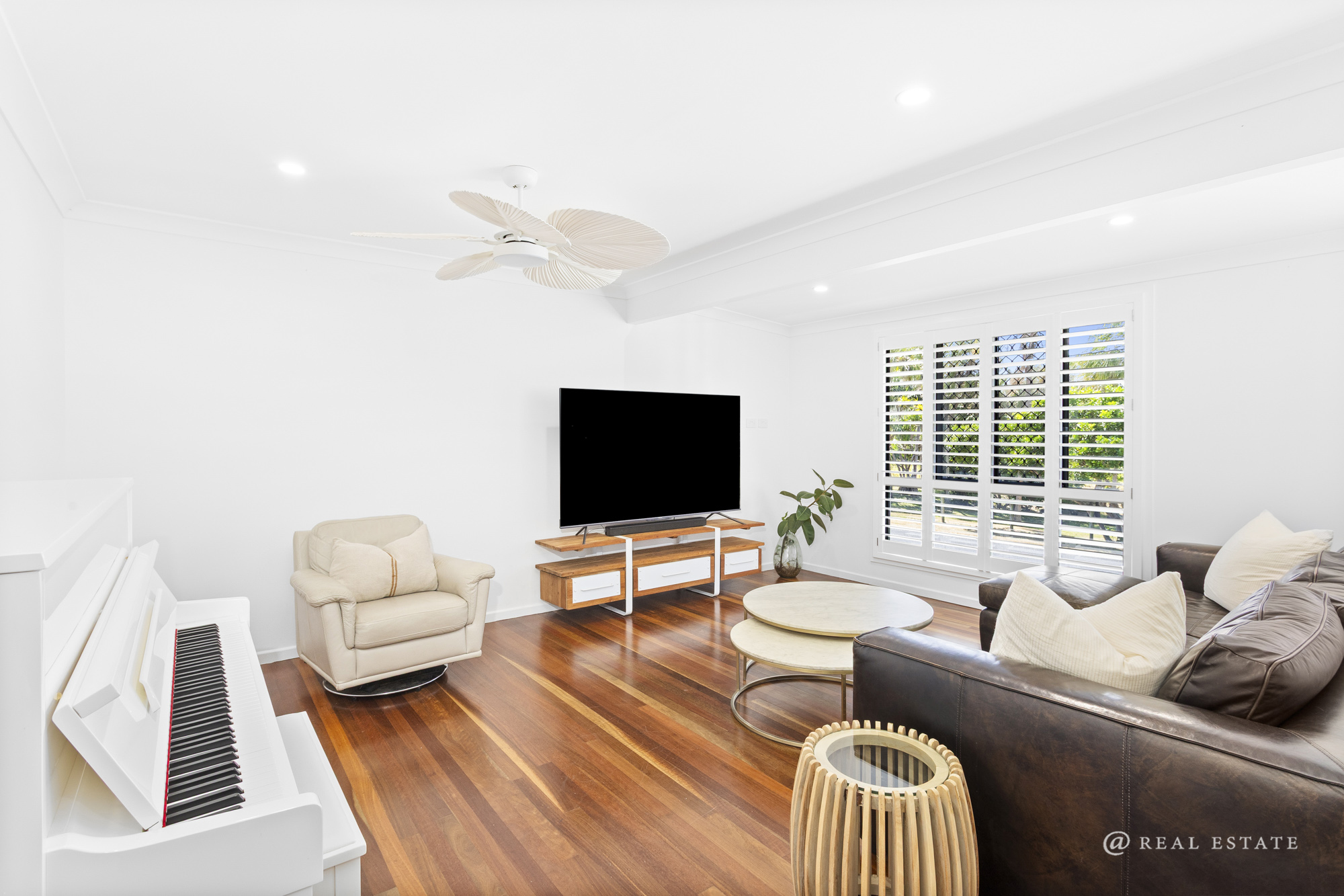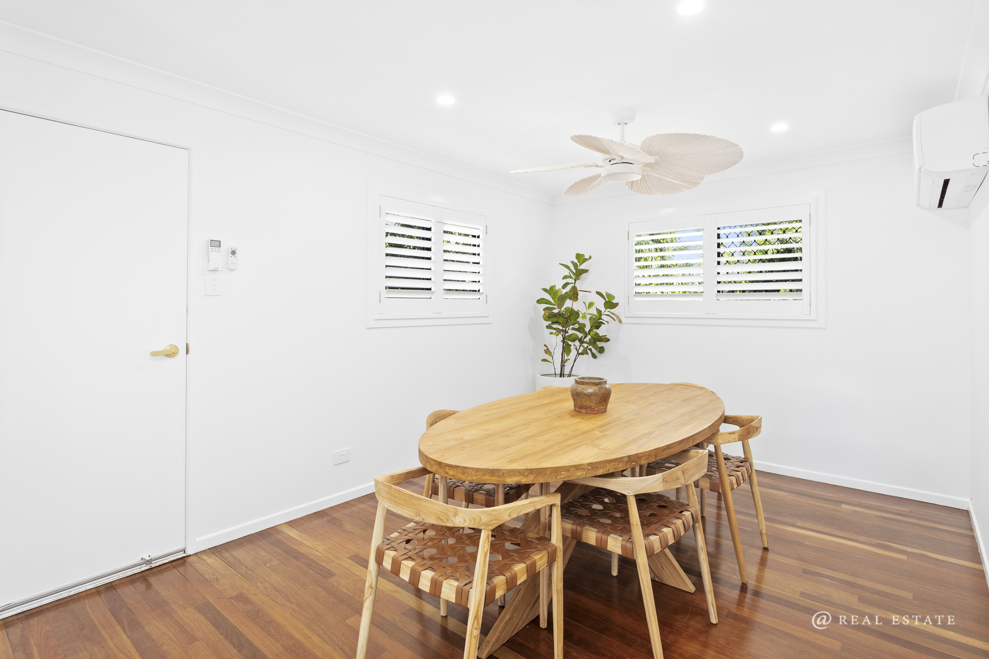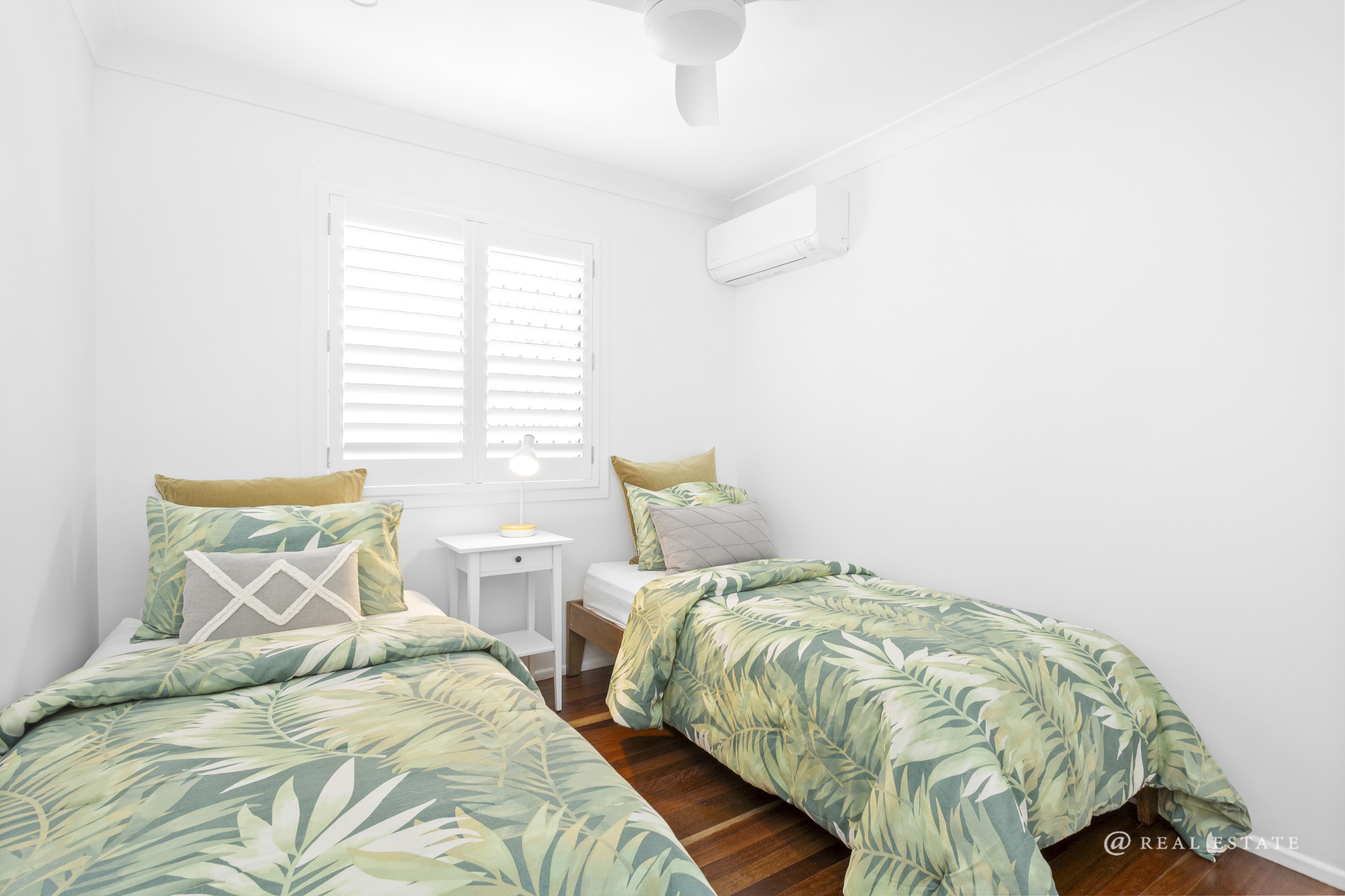 The home comprises five bedrooms, each with air conditioning and ceiling fans. The master suite is a true retreat—expansive in scale and privately positioned, complete with a large walk-in robe and a well-appointed ensuite featuring dual shower and new vanity. Double glass doors open to a private patio, softened by stunning linen sheers.