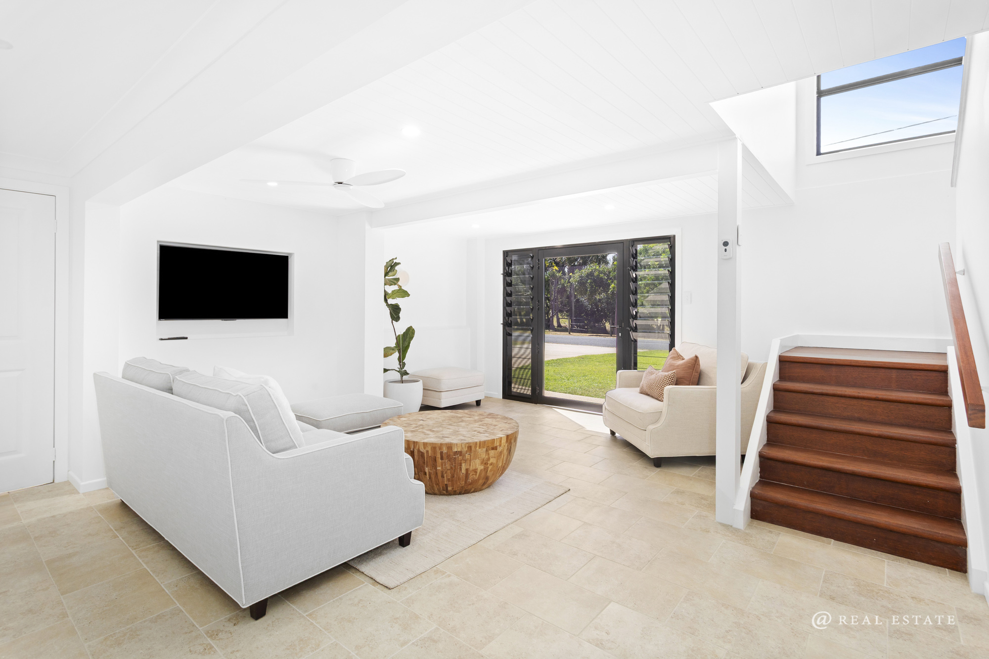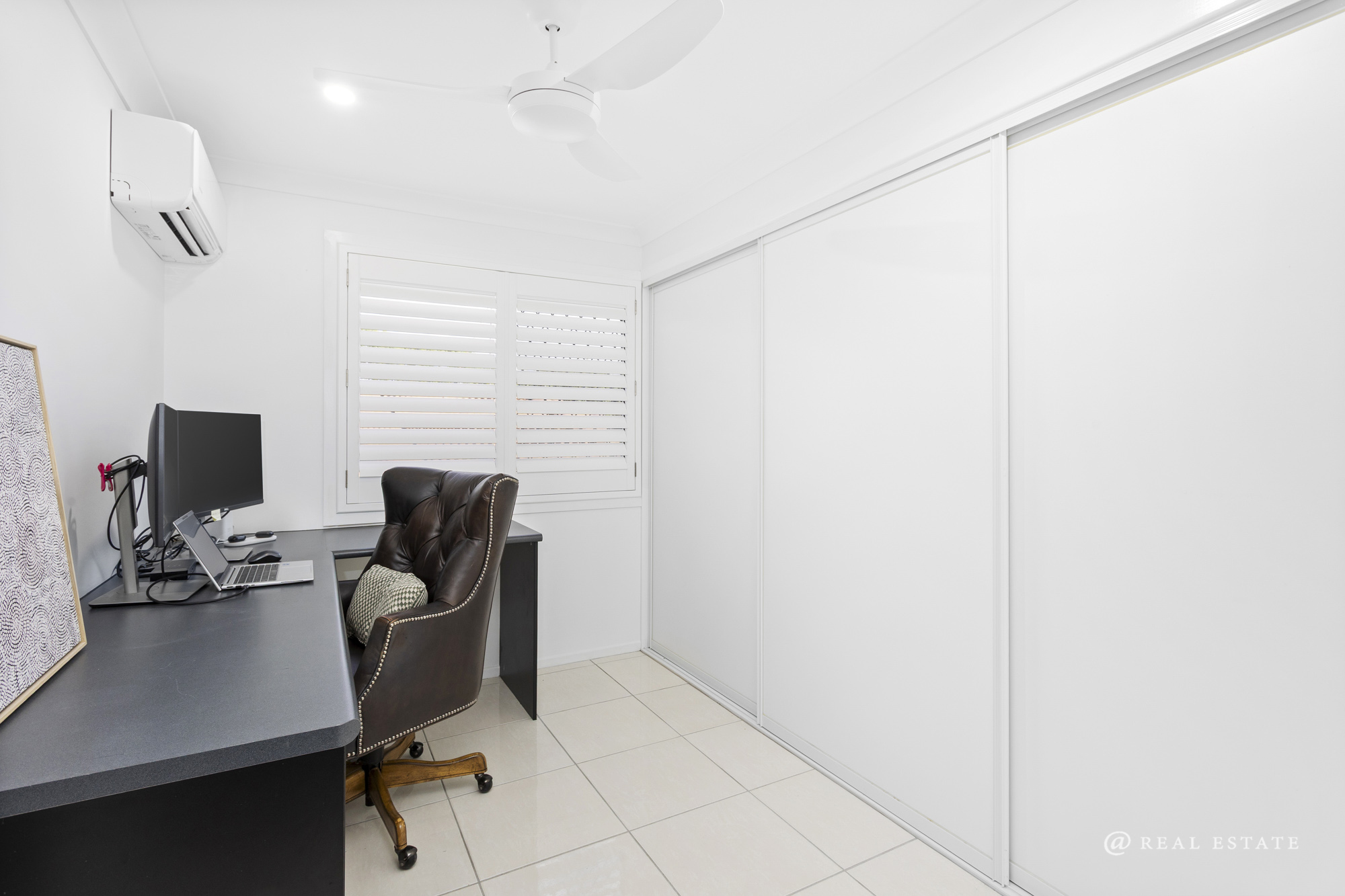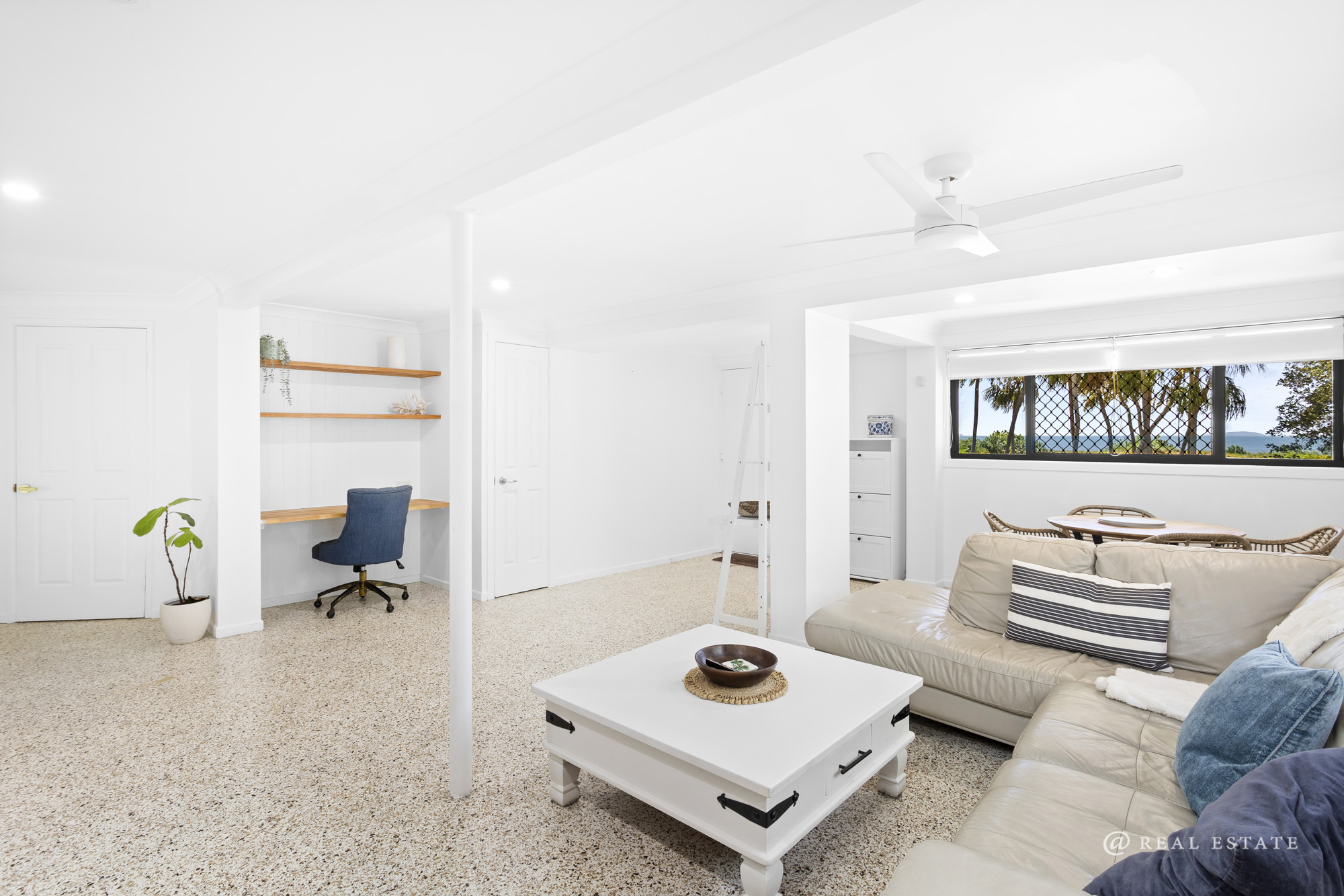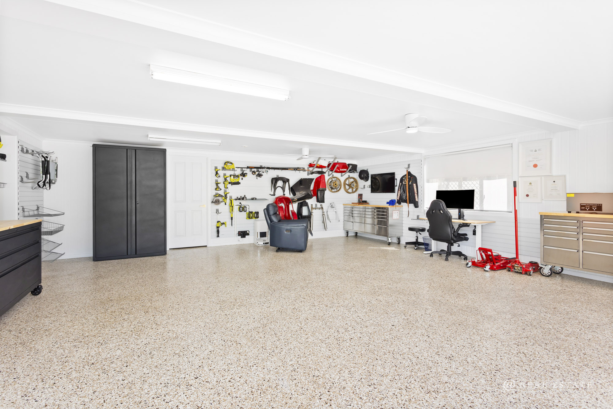 The property continues to impress with a double garage and a dedicated multipurpose space fitted with a premium Storewall system, seamless flooring, ceiling fans, and motorised aluminium roller shutters. Additional storage is provided via a separate room adjoining the garage.