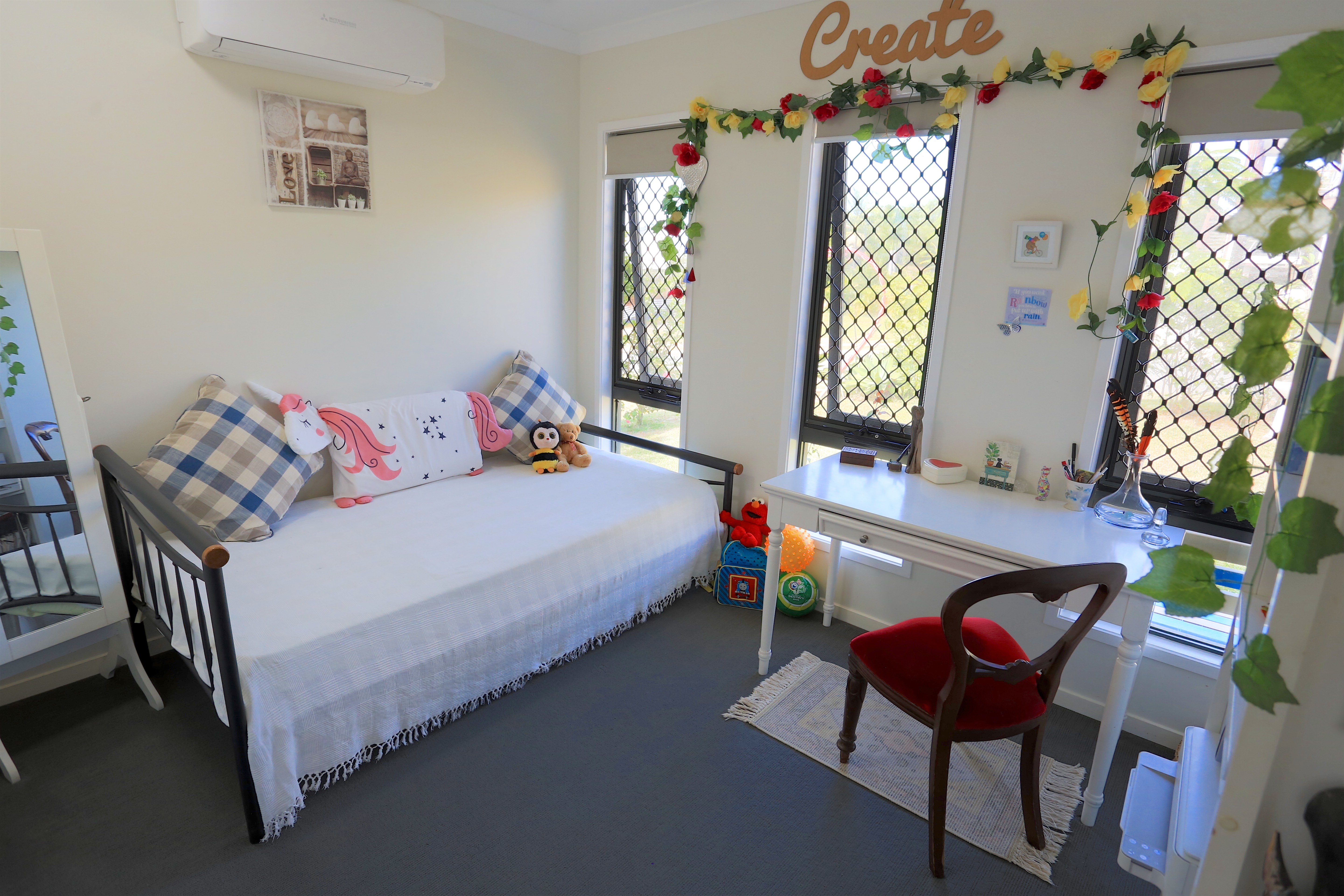 The main bedroom is a standout, offering a peaceful retreat complete with walk-in robe, private ensuite, split system air conditioning, and sliding door access to the patio. An added bonus is the adjoining extra lounge, sitting area or home office space, giving this master suite flexibility that is rarely found. Three additional bedrooms each include built-in robes, ceiling fans, and air con’s, while close by the family bathroom, separate toilet, linen storage, and separate laundry all add to the practicality of the layout.